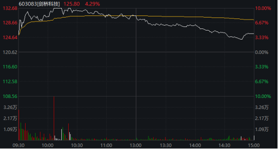 剑桥科技(603083)盘中大幅拉升,一度封涨停。截至收盘,该股涨4.29%报125.8元/股,全日成交84.7亿元。